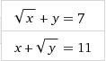 The solution to the above pair...which is quite obvious, is : (x=9, & y=4)